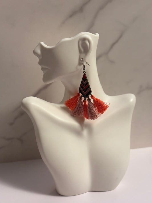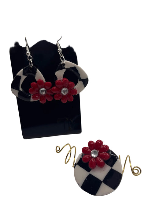 Gem & Crimson Bloom Statement Earrings | Handmade Marbled with Red Floral Accent | Lightweight Dangle Jewelry