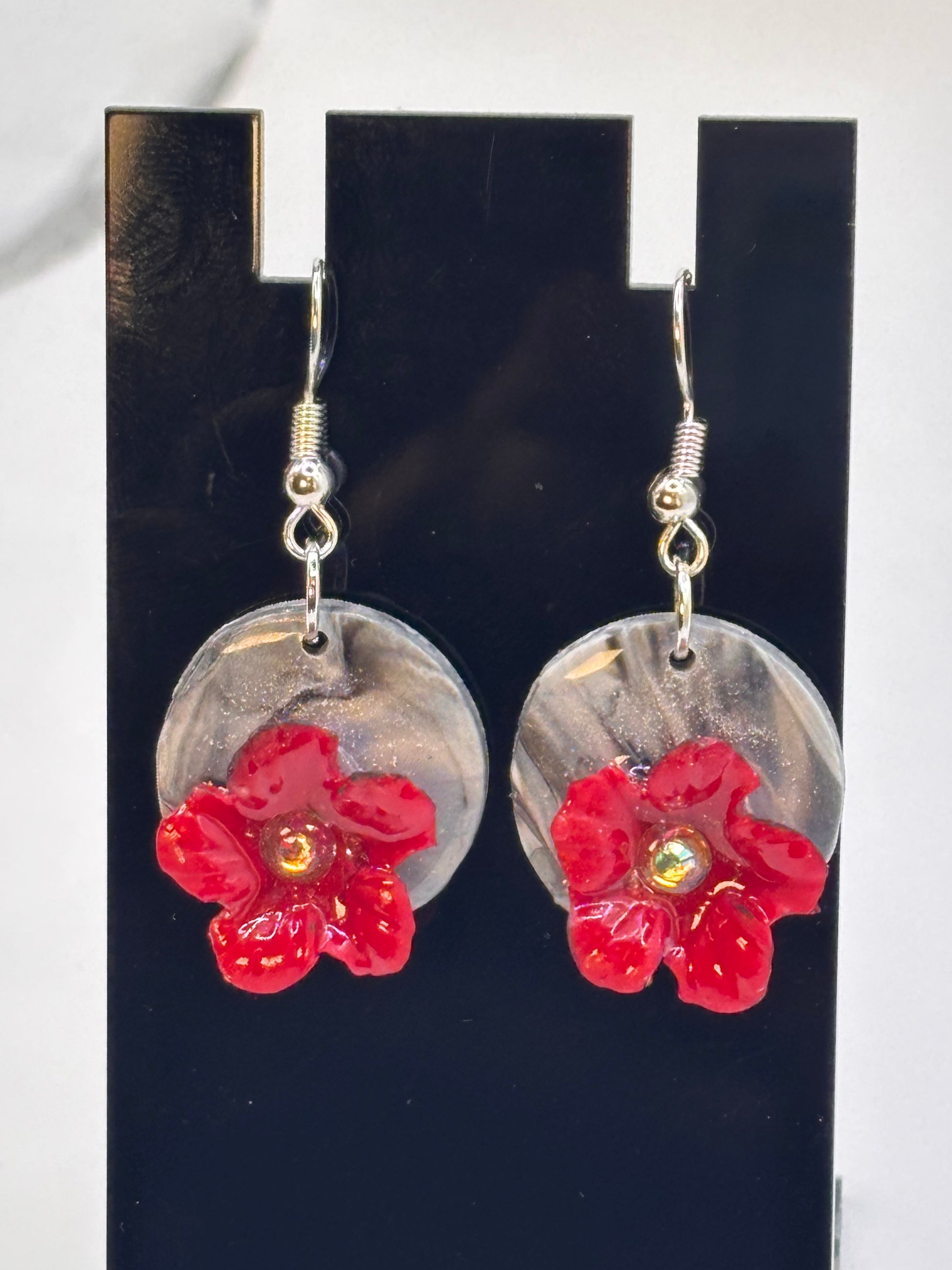 Gem & Crimson Bloom Statement Earrings | Handmade Marbled with Red Floral Accent | Lightweight Dangle Jewelry