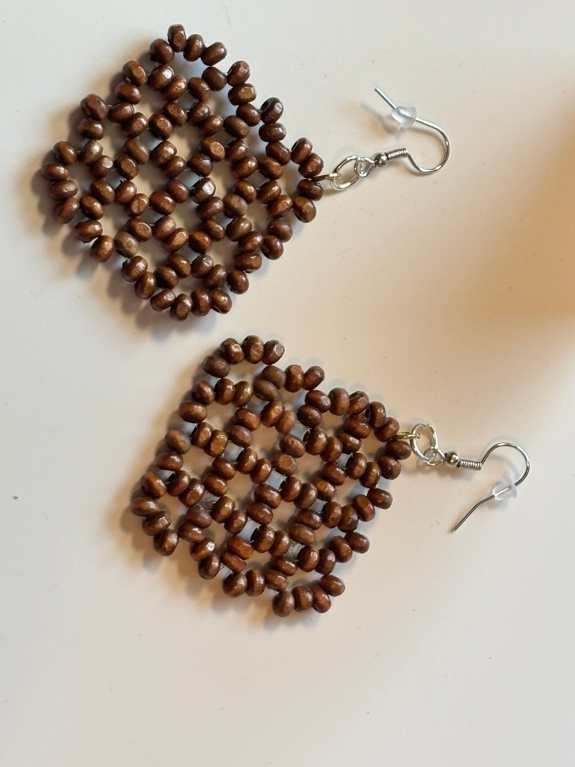 These earrings are a bold, handcrafted statement piece made with small, dark brown beads intricately woven together into a geometric, almost diamond-like pattern. The beads have a natural, wood-like finish that gives the earrings a warm, earthy tone. Their large, dimensional shape makes them eye-catching, while the hook-style ear wires make them easy to wear.