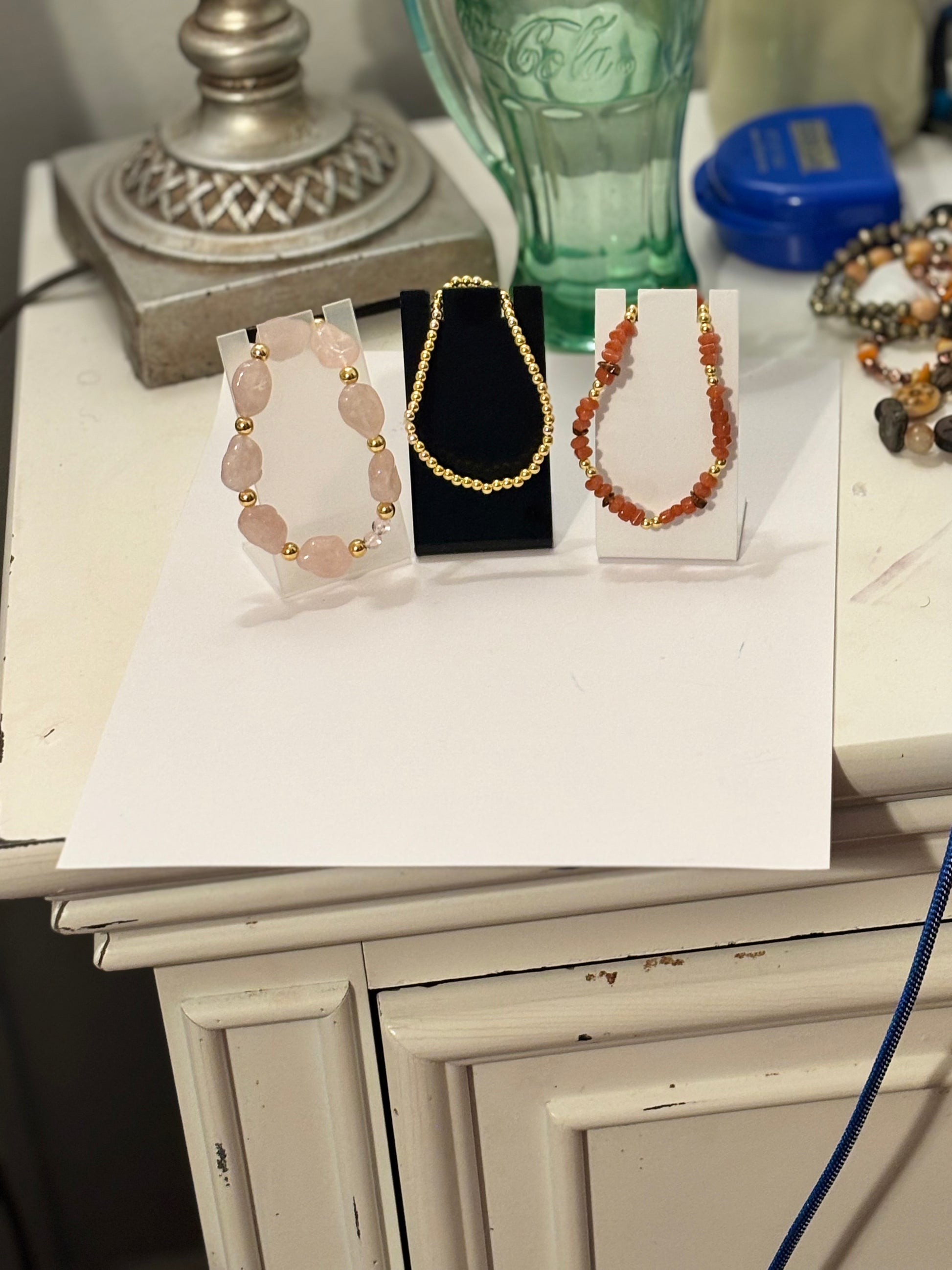 The ensemble includes graceful dangling earrings, three coordinating bracelets, and a striking necklace designed with a cord base that ties for an adjustable, custom fit. Perfectly balanced in color and form, this set exudes refined artistry and timeless elegance.